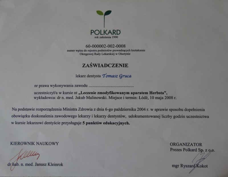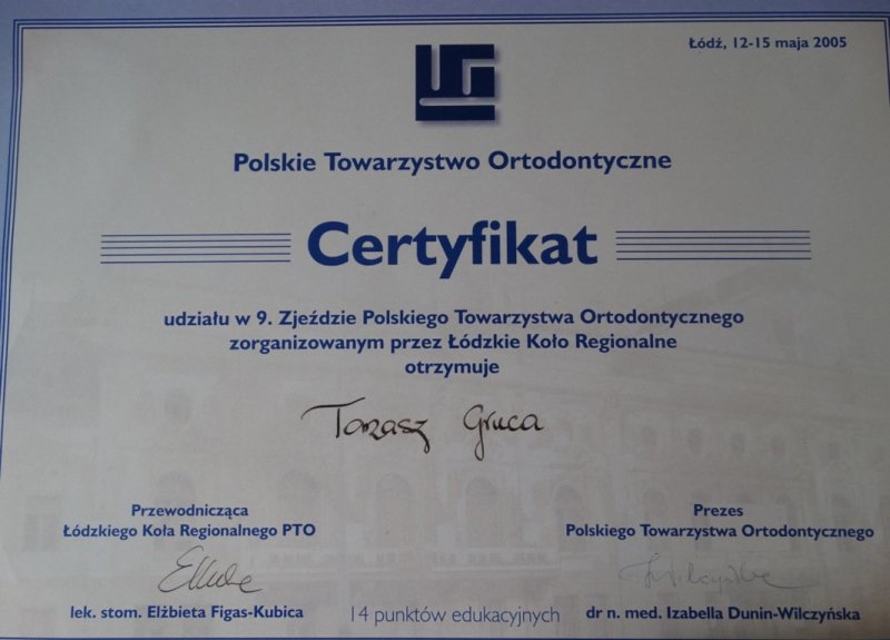 - Lekarz był uczestnikiem 9 Zjazdu Polskiego Towarzystwa Ortodontycznego w dniach: 12 05 – 15 05 2005 oraz uczestniczył w kursie przedzjazdowym prof. V.G.Kokicha: Faza końcowa leczenia ortodontycznego- co każdy klinicysta powinien wiedzieć.